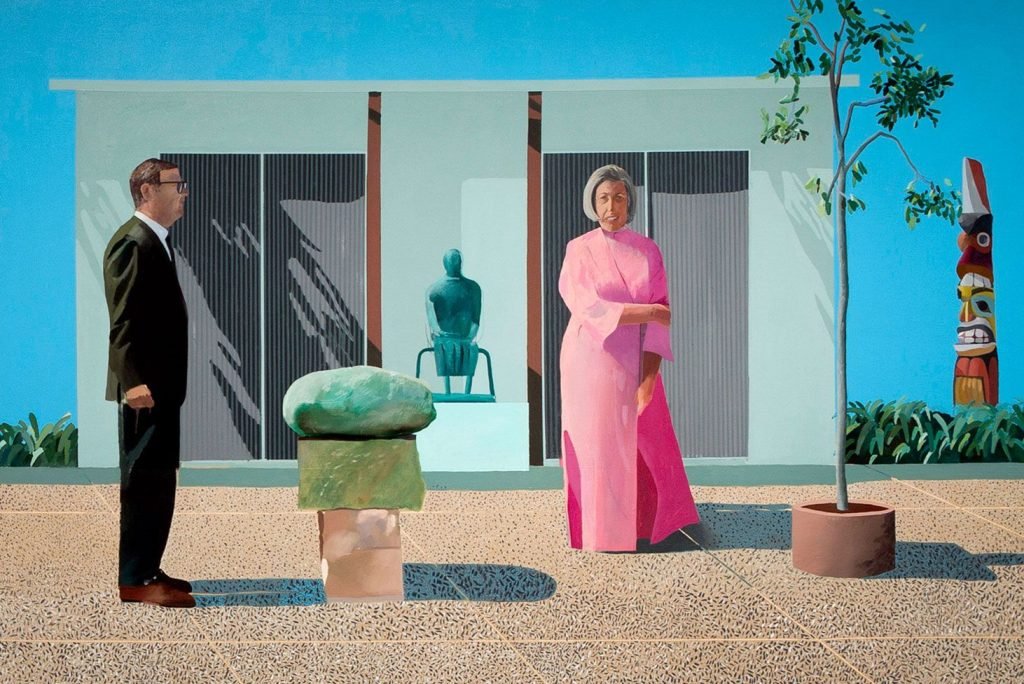Cette peinture présente le couple d’artisans et de mécènes Fred et Marcia Weisman dans leur résidence à Beverly Hills. La composition est un collage photographique et peint, un style que Hockney a popularisé à l’époque.